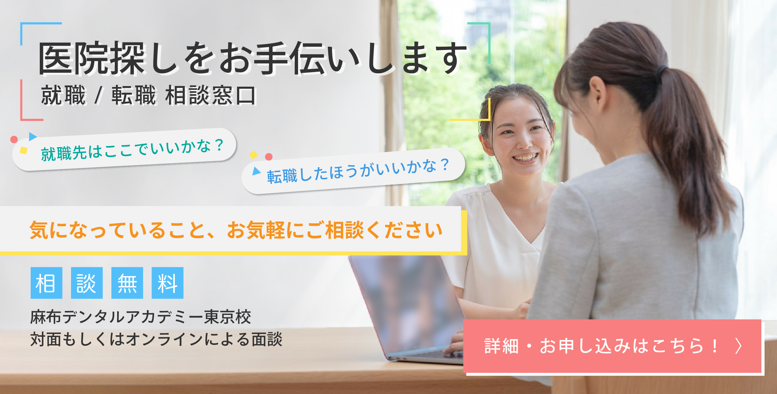 多くの歯科医師を輩出した麻布デンタルアカデミーのベテランスタッフが、一人一人の就職/転職について真摯に相談に乗ります。
